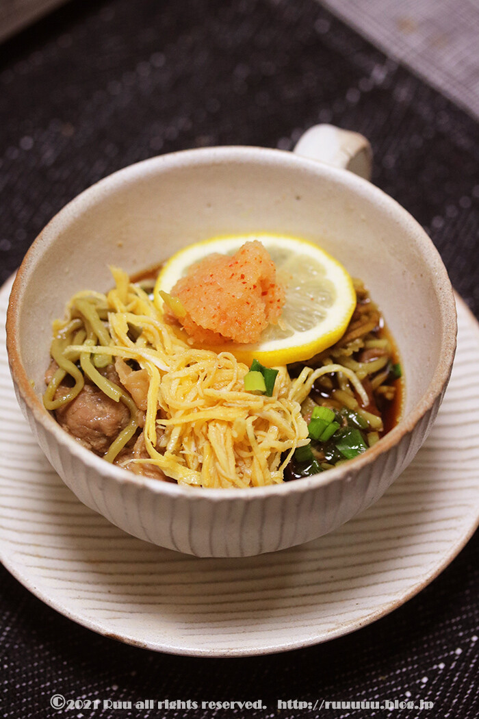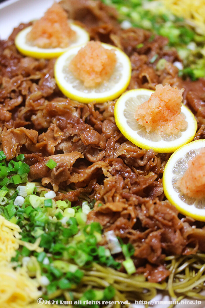 具は、錦糸卵、焼き海苔、ネギ、レモン、もみじおろし、