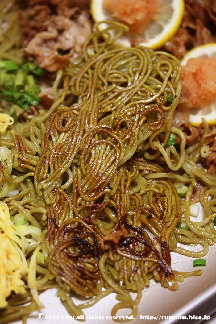 お蕎麦は軽く茹でて、ごいごい洗い、熱したホットプレートでごいごい加熱。