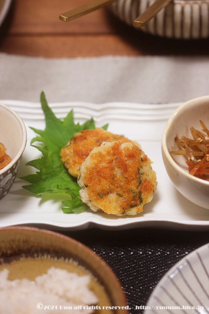 袋の上から潰したはんぺんに、明太子と刻んだ大葉、シュレッドチーズとつなぎ程度の片栗粉を入れ、