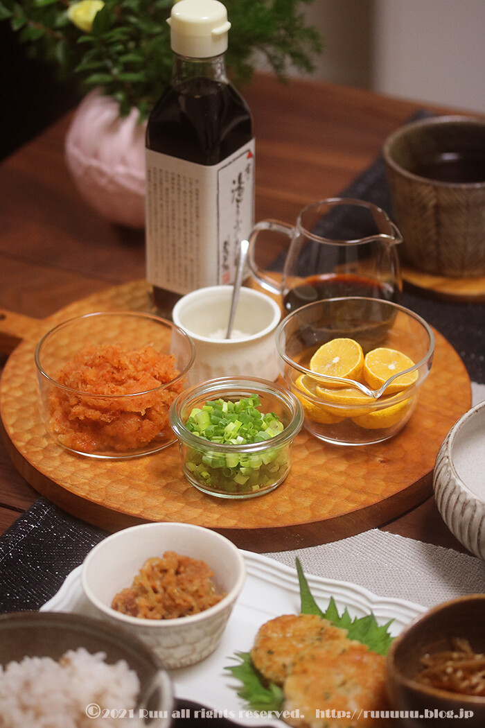 この日のタレ&薬味は、刻みネギ、もみじおろし、すだち、塩、ポン酢、京都の湯豆腐のタレ。