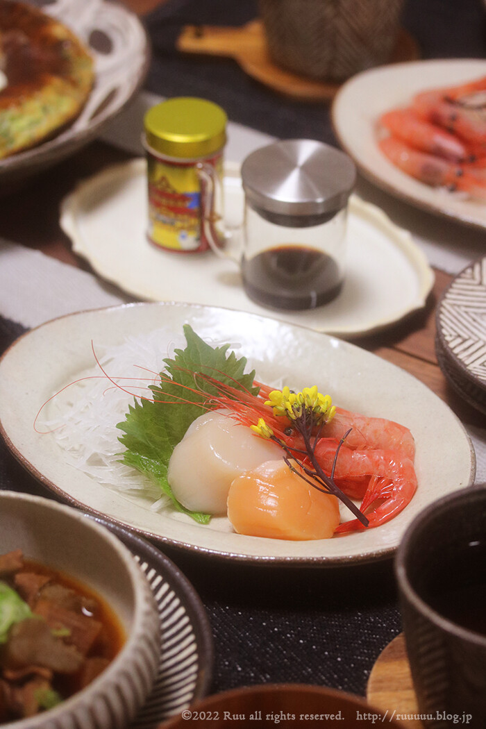 お刺身は冷凍庫にあったほたてと、