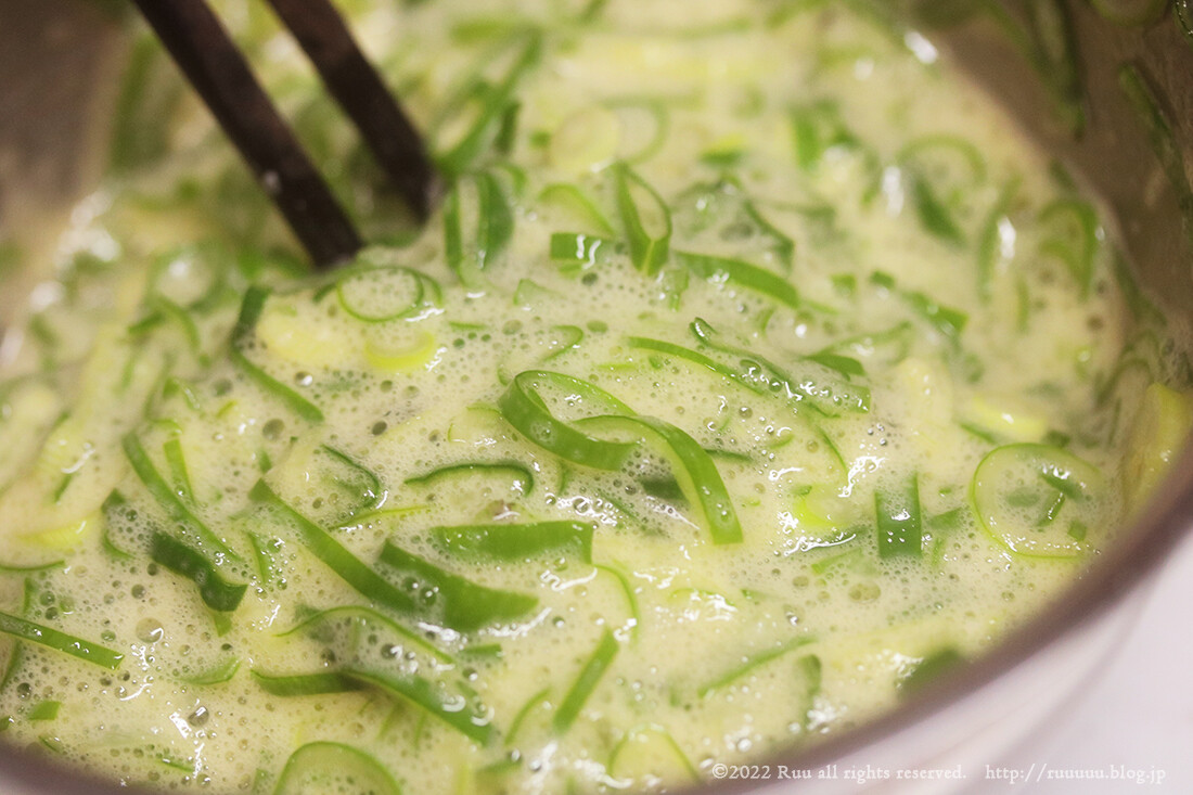 多分、小口切りのネギが泡だて器の役割を担ってるんじゃないかな、と思うんですけど、