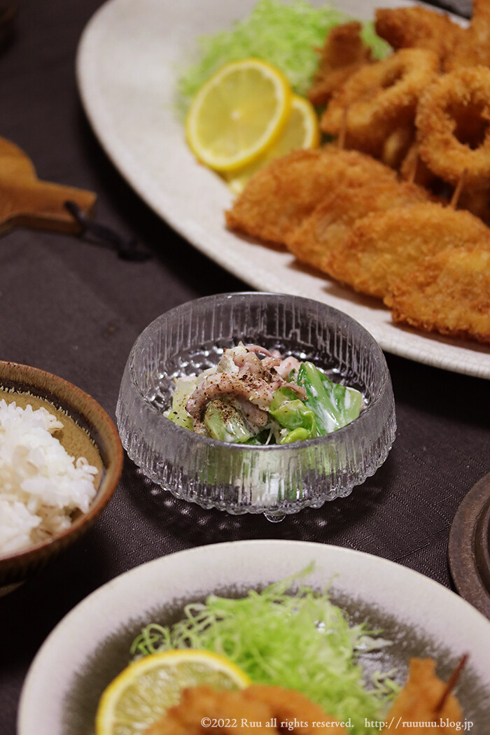 さっと湯がいたキャベツ(←食感を残したいので、さっとお湯に入れたらすぐ冷水にあげる感じ。ホントさっと湯がくだけでOK)と、さっと茹でたいかゲソをマヨネーズとたっぷりの胡椒で和えたサラダ。