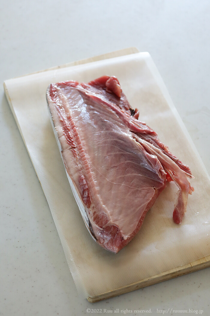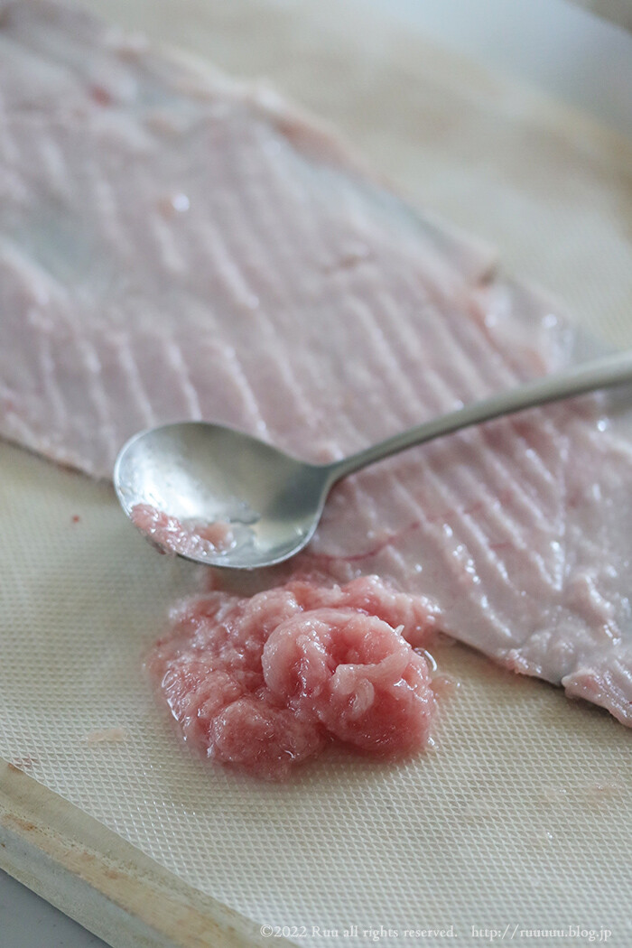 これは、まぐろのごっつい皮を軽く茹でて(30秒から1分くらい)、