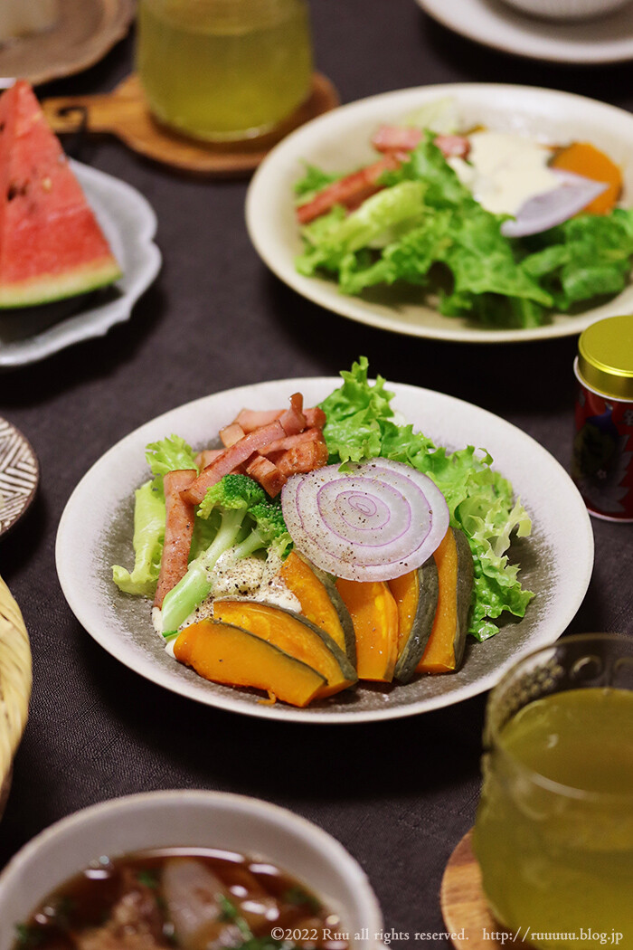 そして、この日、唯一手間をかけた料理がかぼちゃのシーザーサラダ。