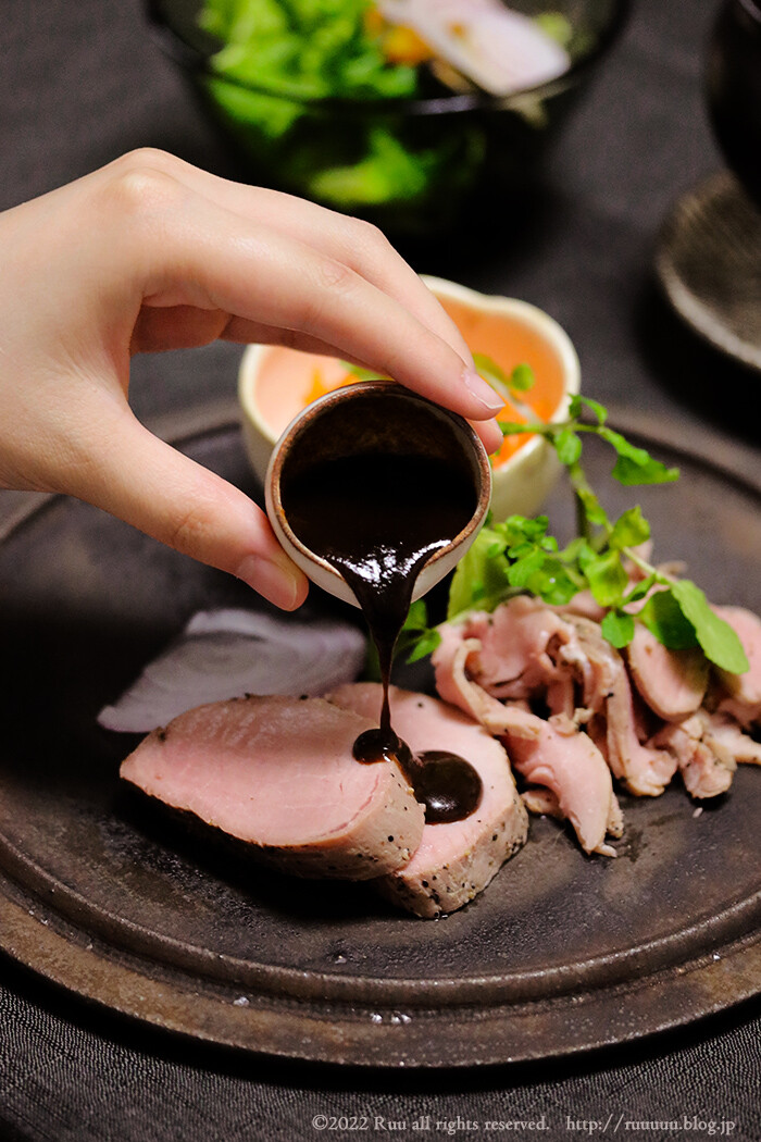 (ローストポークの肉汁をパックから絞り出して、そこにバルサミコ酢と醤油とみりんとにんにくを入れて煮詰めると、お店もびっくりなくらい美味しいソースができます)、