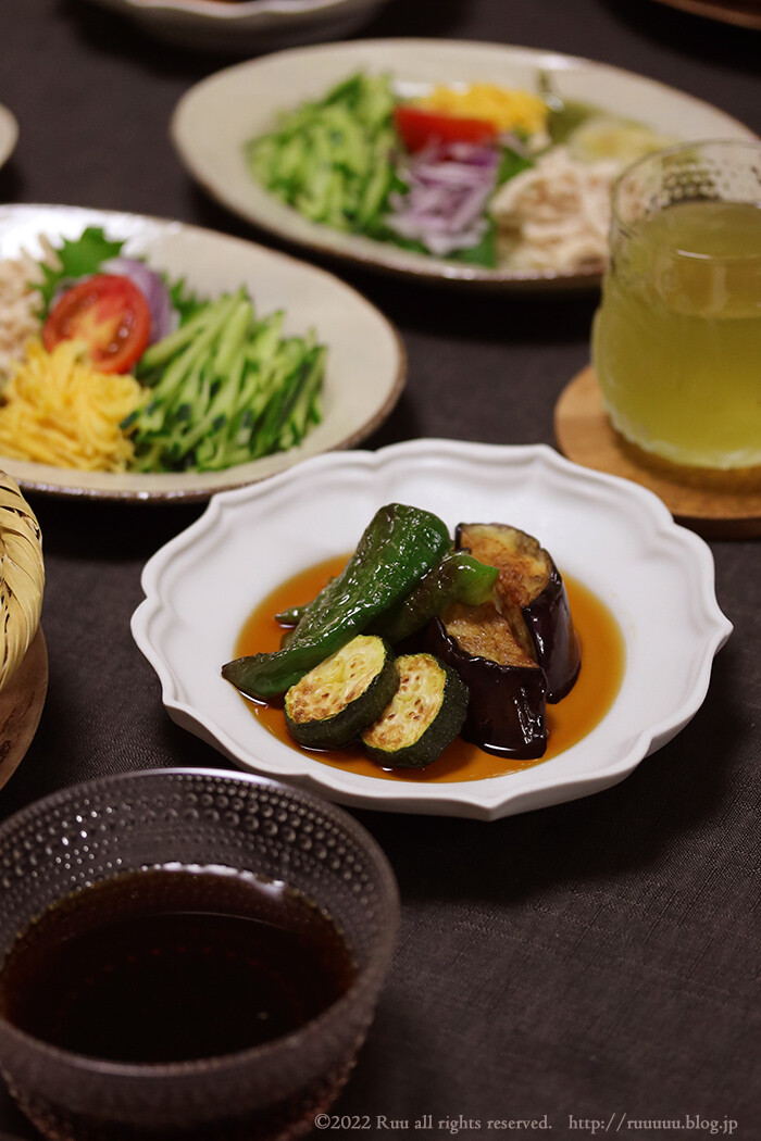 素揚げというか揚げ焼きした茄子&ズッキーニ&ピーマンをじゅじゅっとお出汁にひたして、