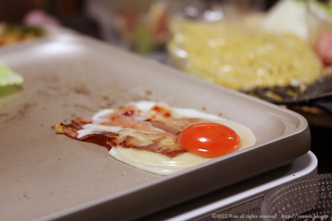 最終的にはベーコンエッグが焼かれてました。