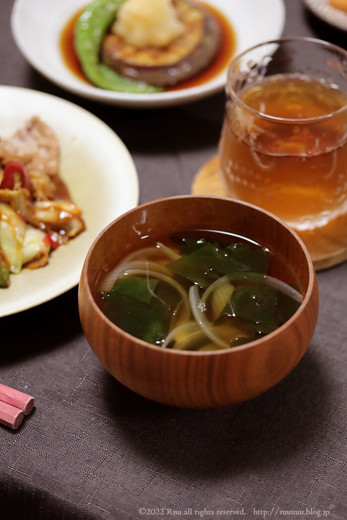 わかめと玉ねぎのお吸い物というか醤油汁というか、まぁそんな感じの汁物。