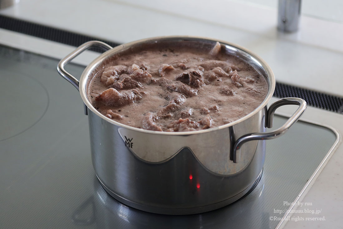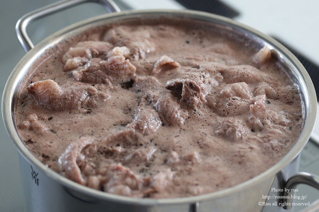 輸入牛の牛すじは灰汁が多いので、もう一度1~3を繰り返し、茹でこぼしてください。