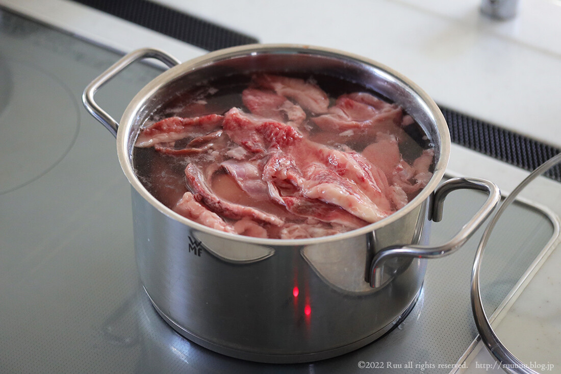 和牛の牛すじは灰汁が少ないので、このまま工程4へ。
