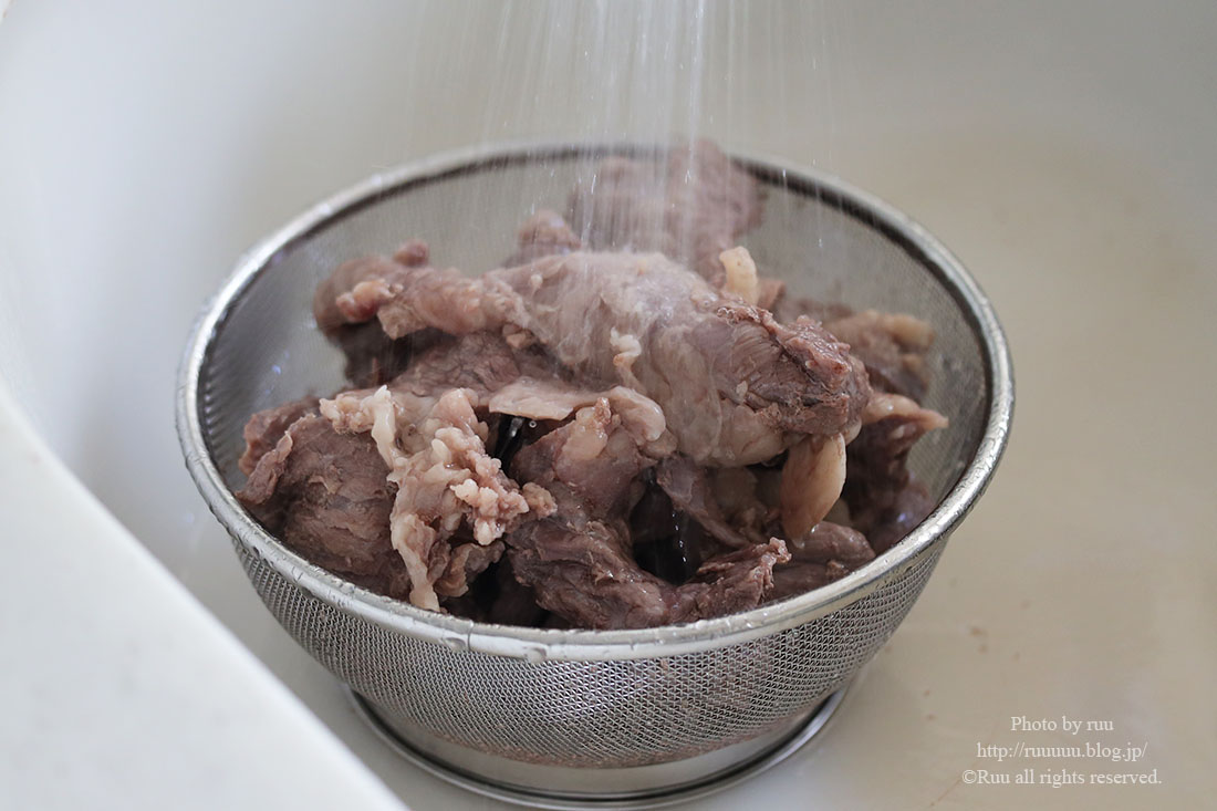 3:牛すじをざるにあげ、お湯で軽く洗って灰汁を落とす。灰汁のついた鍋もお湯で洗って灰汁を落とす。