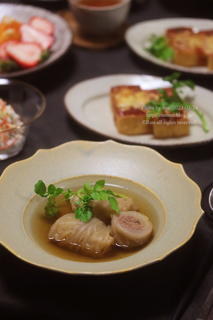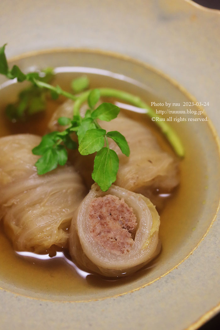 ロールキャベツは基本的にコンソメスープで煮ますが、