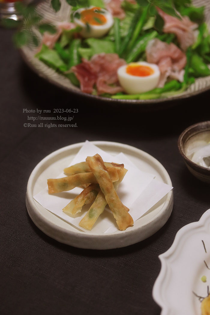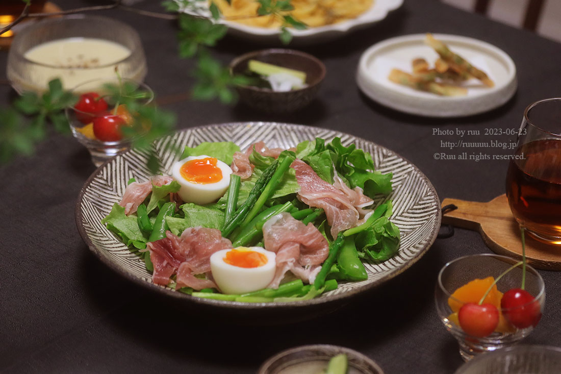 たっぷりのお野菜は、昨日スーパーで買った見切り品50円のレタスと、見切り品30円のスナップえんどうと、いただきものの採れたて新鮮アスパラ。