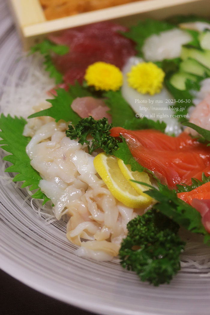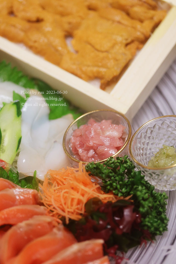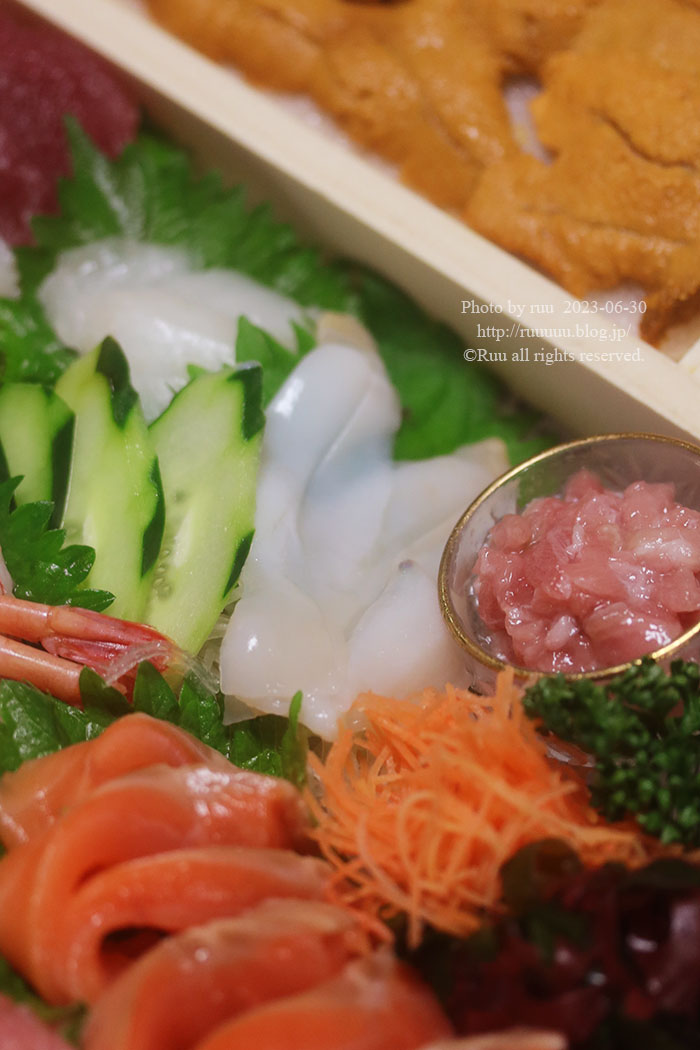 (うに、大トロ、本物のトロのたたき、まぐろ赤身、サーモン、とろサーモン、ばい貝、えんがわ、きはだまぐろ、いか、甘えび、かにみそ、ローストビーフ、卵焼き、アボカド・きゅうり・オニオンスライス、茗荷)