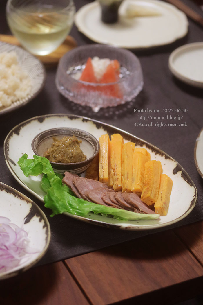 手前にあるのはローストビーフでローストビーフを巻くときはバルサミコ酢のタレがあるからそっち使ってね。