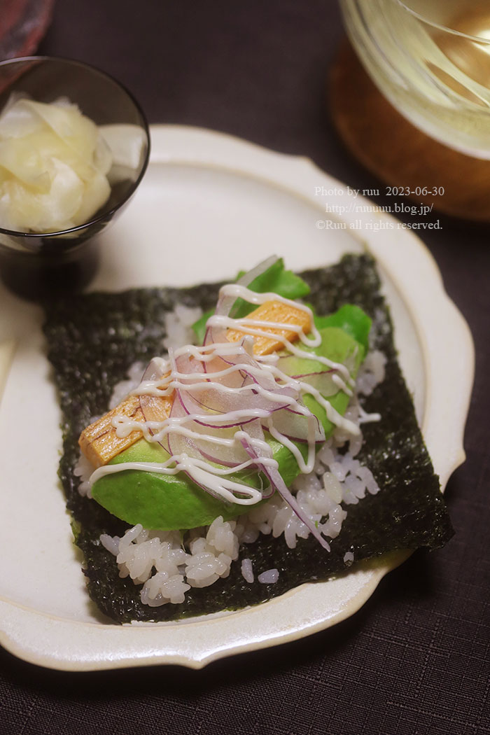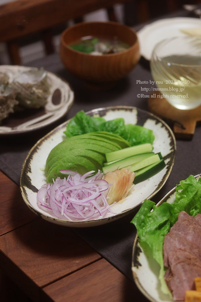 あと、こっちの皿は野菜と薬味とアボカドね。好きに巻いて食べて。」