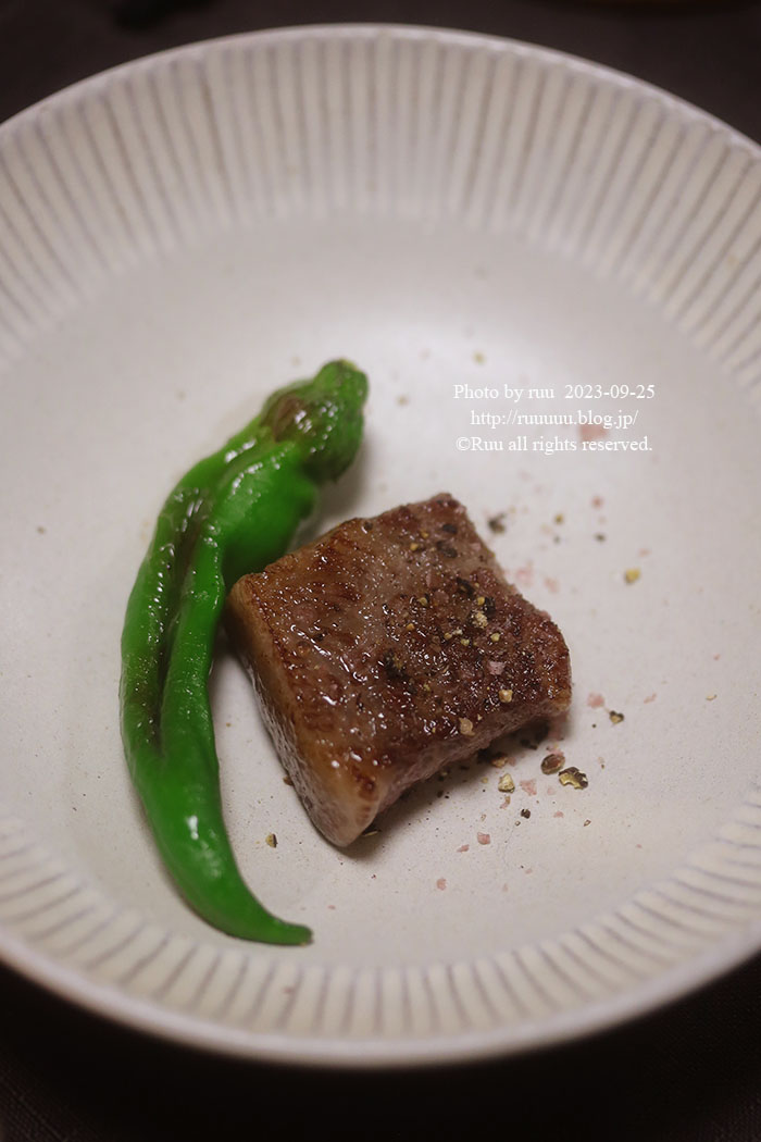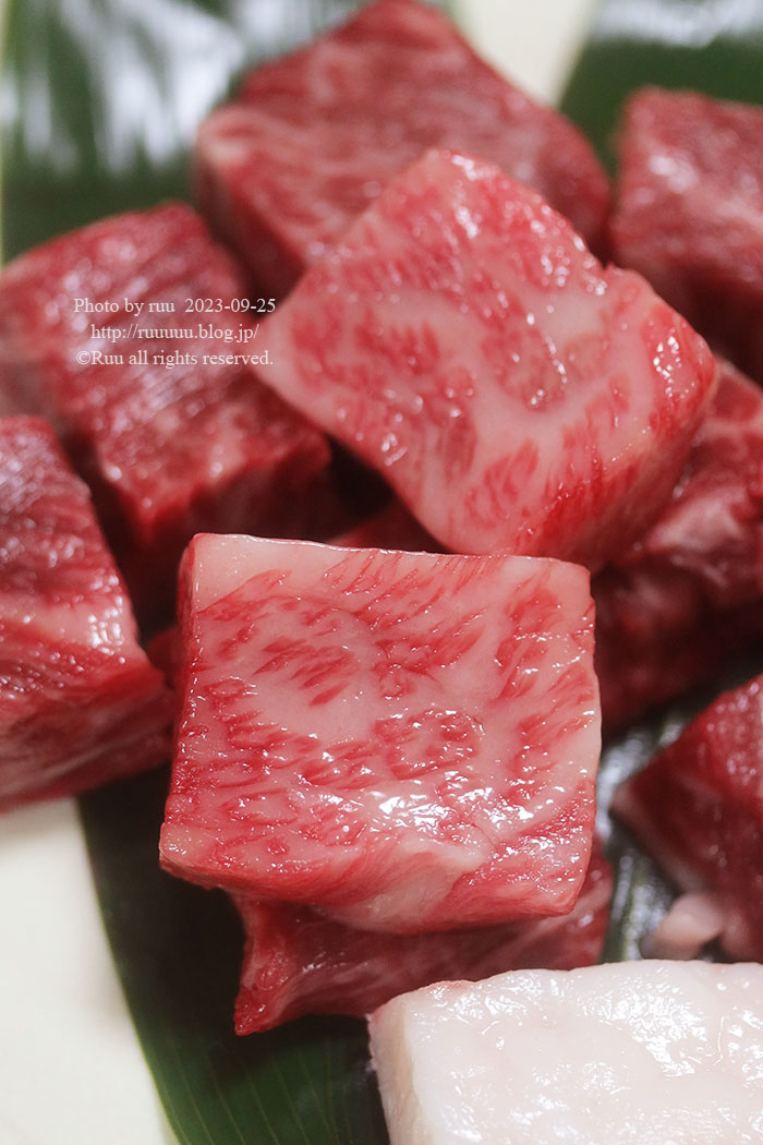 こちらの四角いカットの松阪牛は、大好き三重松良さんの紅白サイコロステーキ。