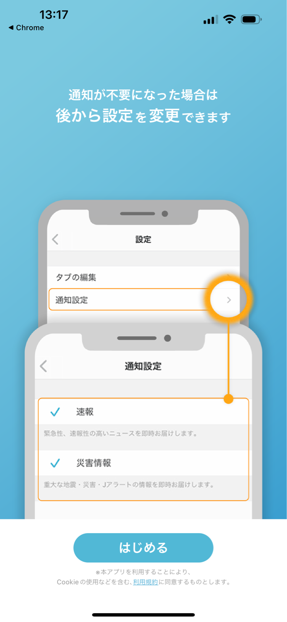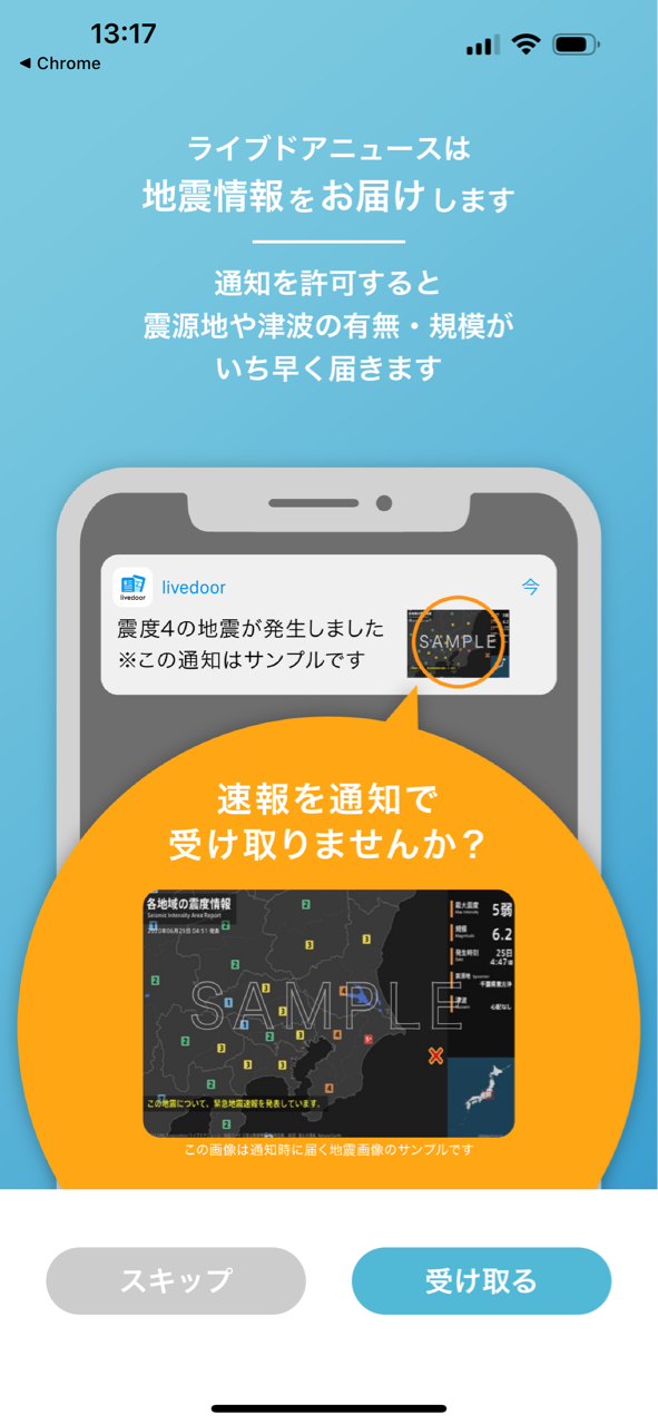 4:するとこんな画面がでてきます。これは地震情報を通知できるけど送ってもよろしいか?と聞いてるので、必要なら受け取るを、不要ならスキップをクリック。