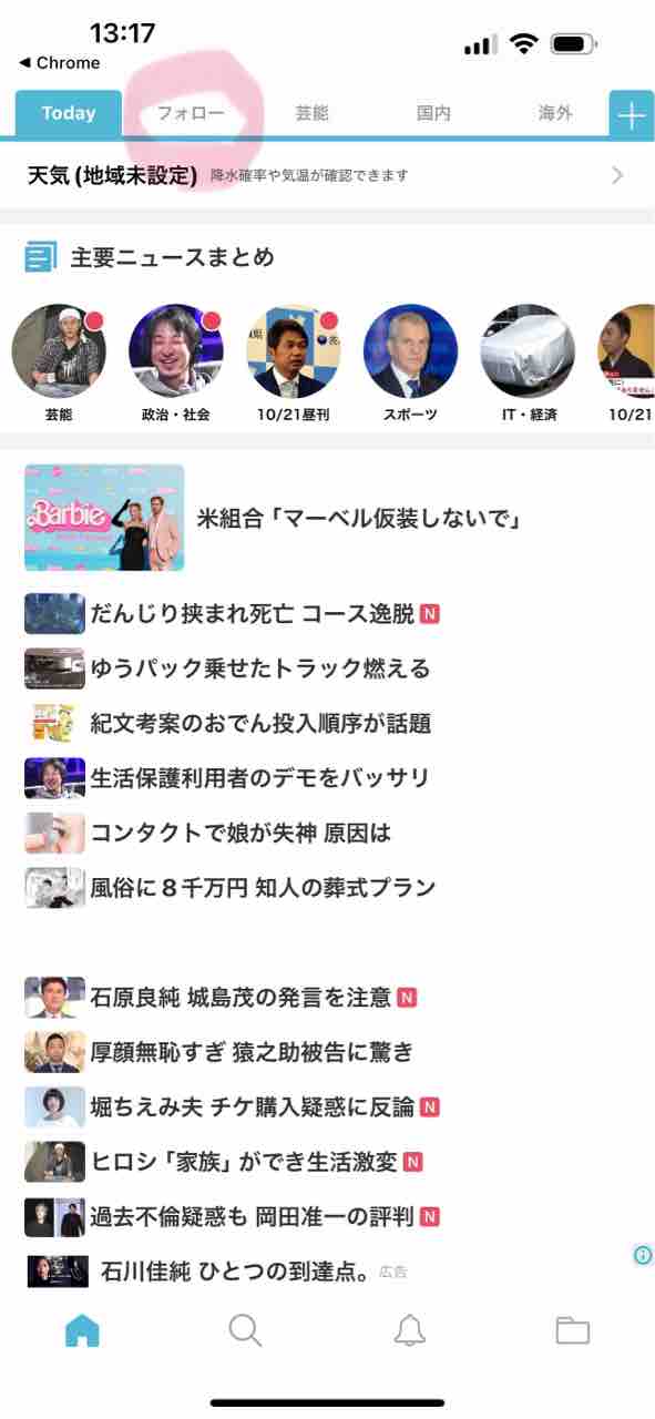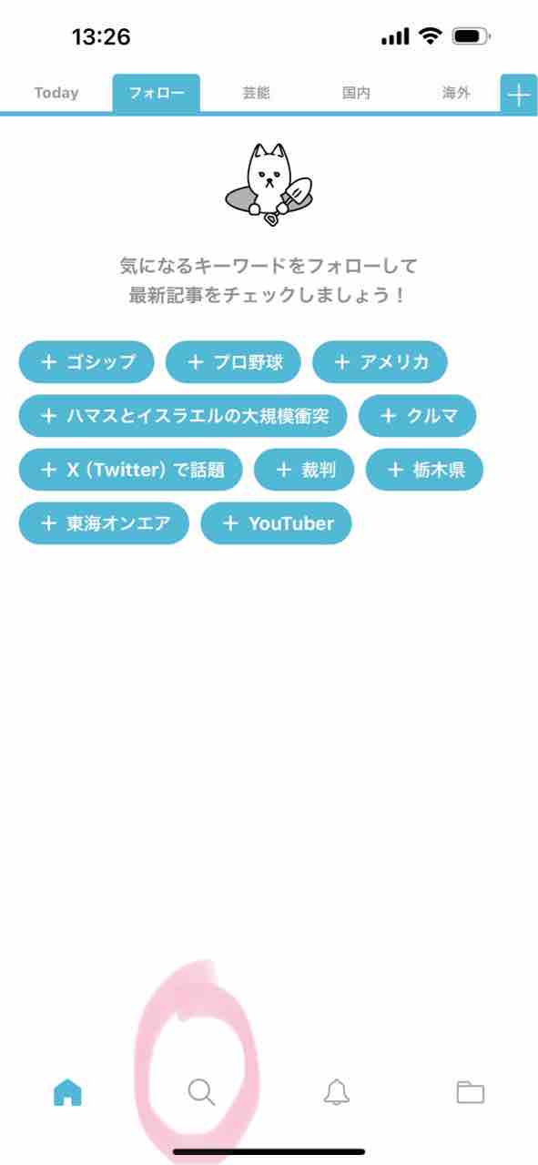 6:はじめるをクリックすると、ニュース画面がでてくるので、フォロー(ピンクで囲ったとこ)をクリック。