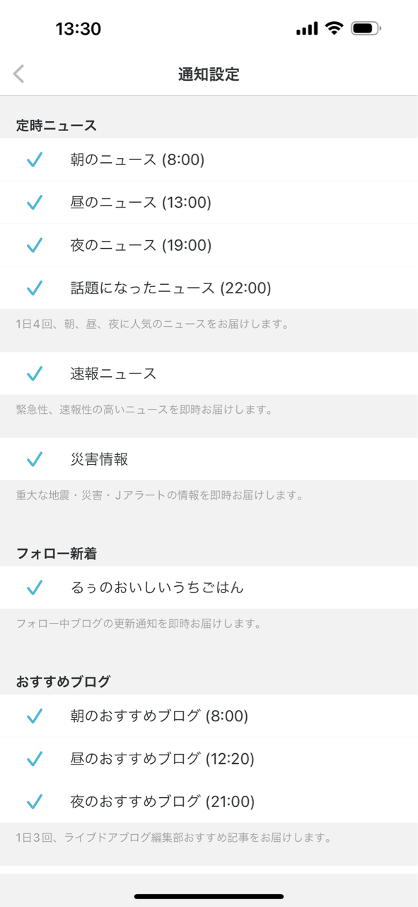 初期の設定はブログの更新通知だけではなく、朝のニュースや話題のニュース、速報など全てのプッシュ通知がONになってるので、「こんなにいらんわ」って方は「通知の設定を変更する」をクリック。