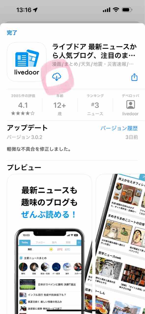 2:そうすると、こんな画面がでてくるので「入手」か雲みたいなマーク(ピンクで囲ったとこ)をクリック。すると勝手にダウンロードがはじまるのでそのまま15秒ほどお待ちください。