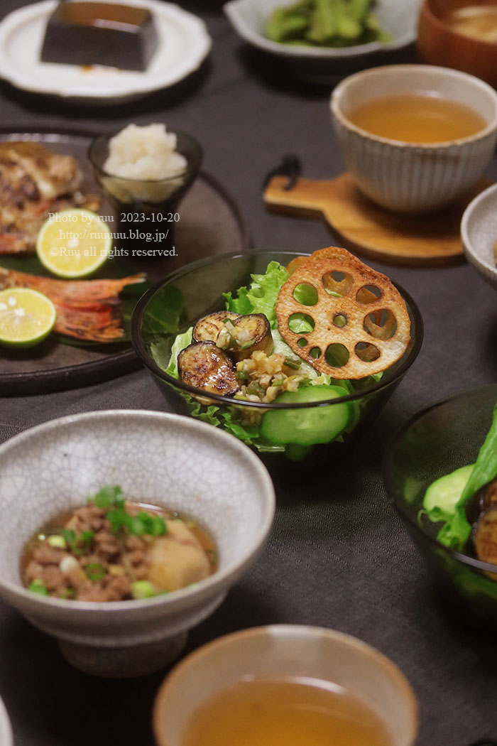 サラダには揚げ茄子と揚げれんこんのトッピングでおかず感UP。