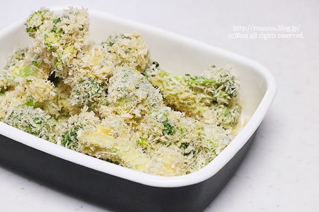 ボウルにブロッコリーを入れて、粉をかけ、ざっくり混ぜる程度でOKです。