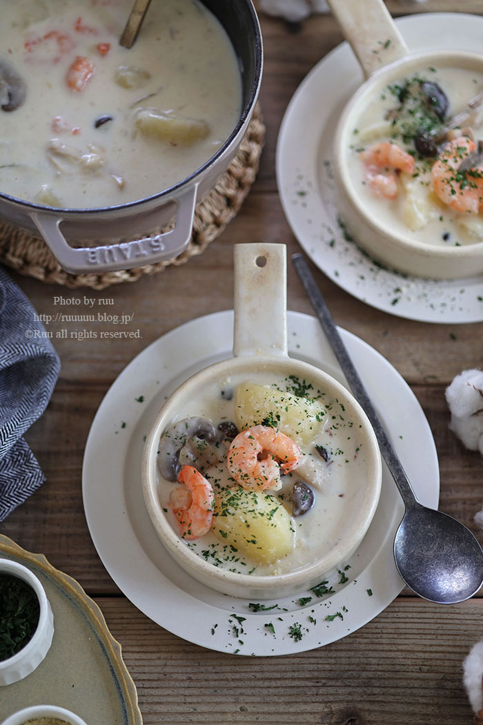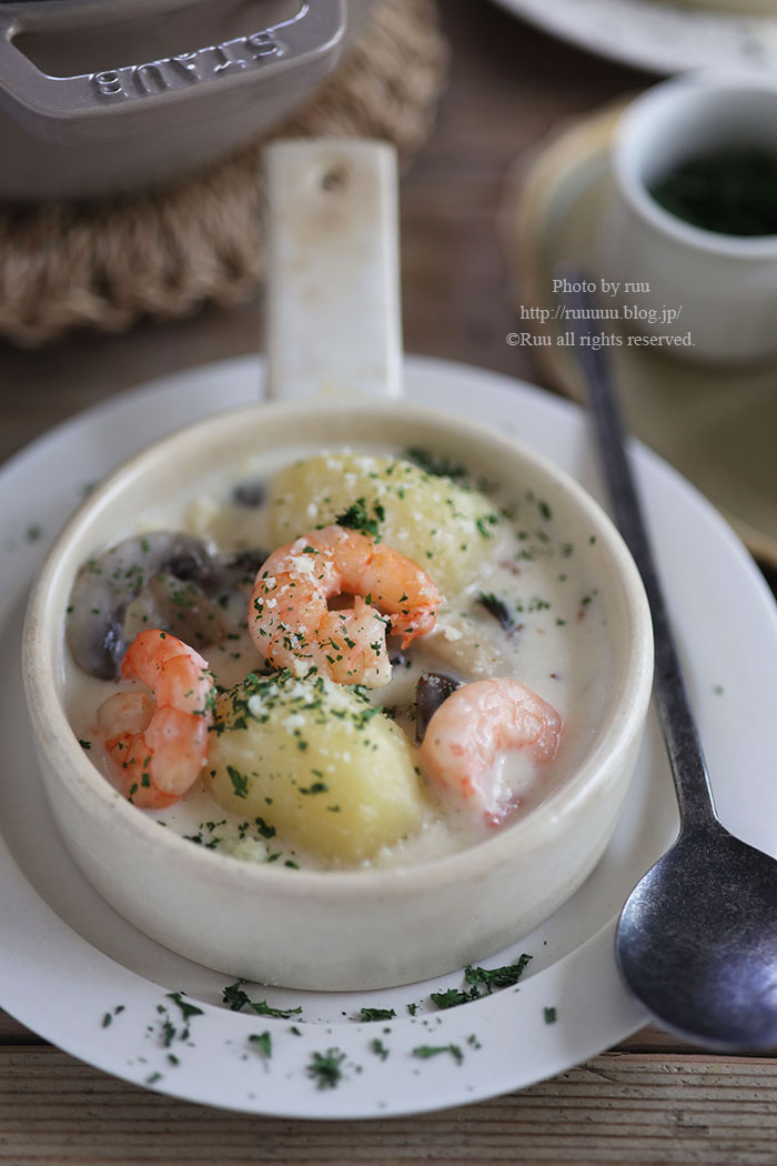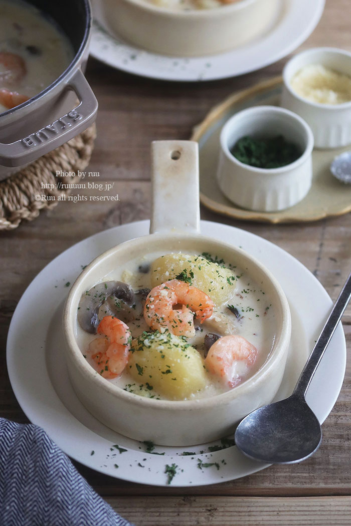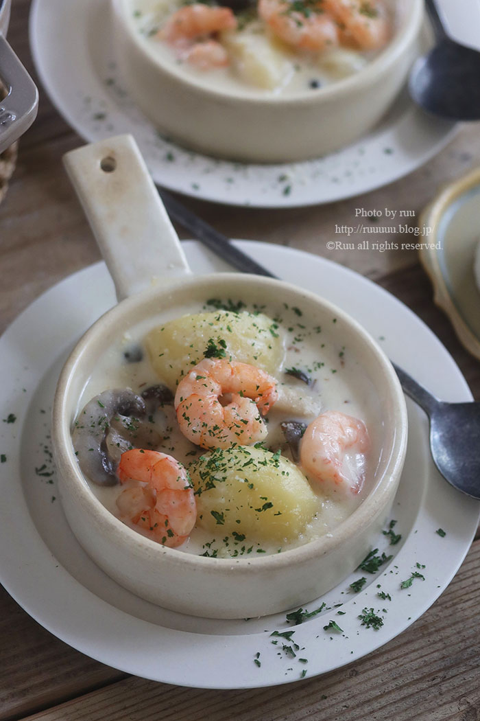 プリっとした海老が艶やかに輝くこちらは、今が旬のシチュー。