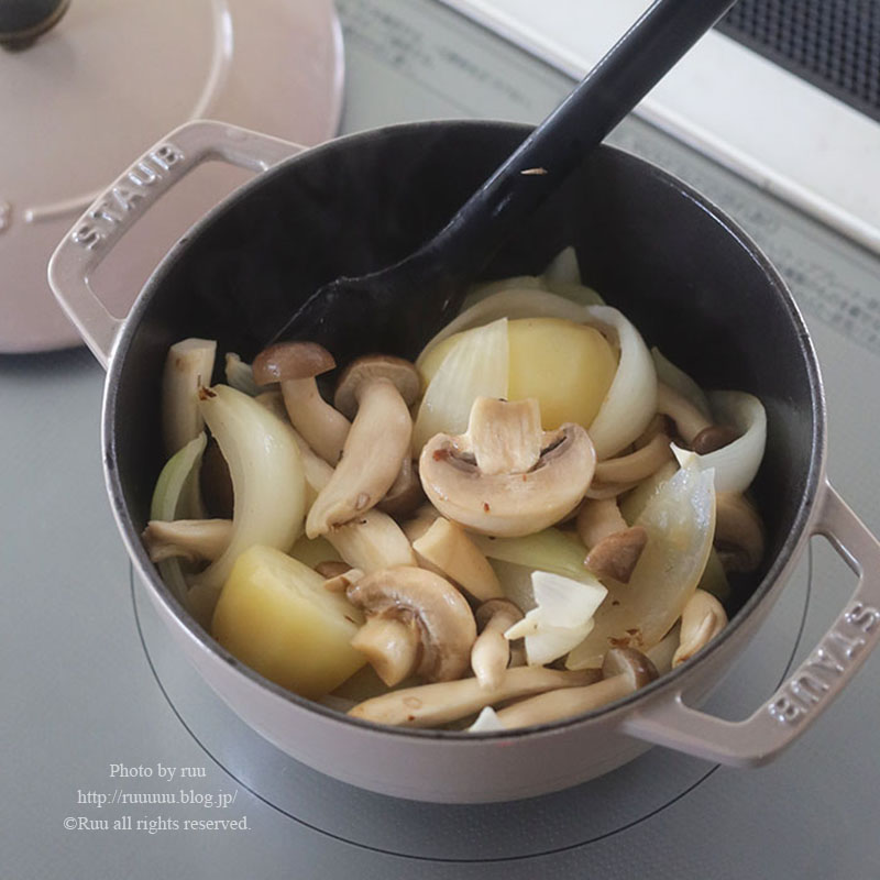 2:次に水とブイヨンを入れて、具材に火が通るまで煮ます。