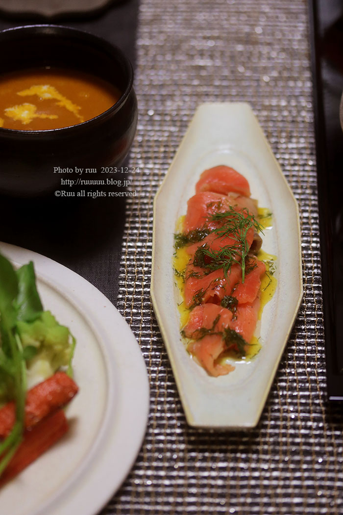 それに塩と胡椒と砂糖とたっぷりのディルを擦りこみ、パーシャルで3日ほど寝かせ、薄~くスライス。