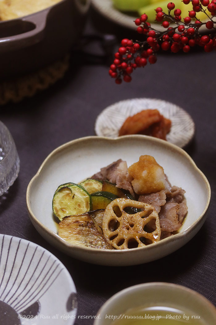 揚げびたしの具は、茄子、ズッキーニ、れんこん、かぼちゃ、カルビ。