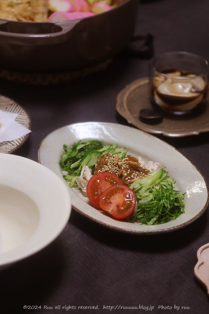きゅうり、千切りのレタス、ささみ、ミニトマトからなる棒棒鶏と、