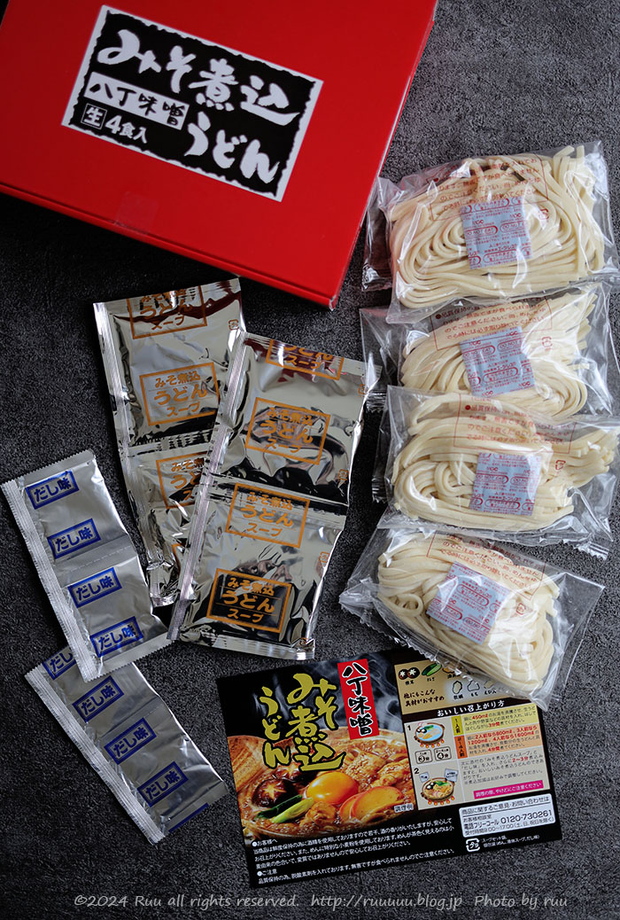 中身はうどん4玉、だし味4袋、味噌煮込みうどんスープ4袋。