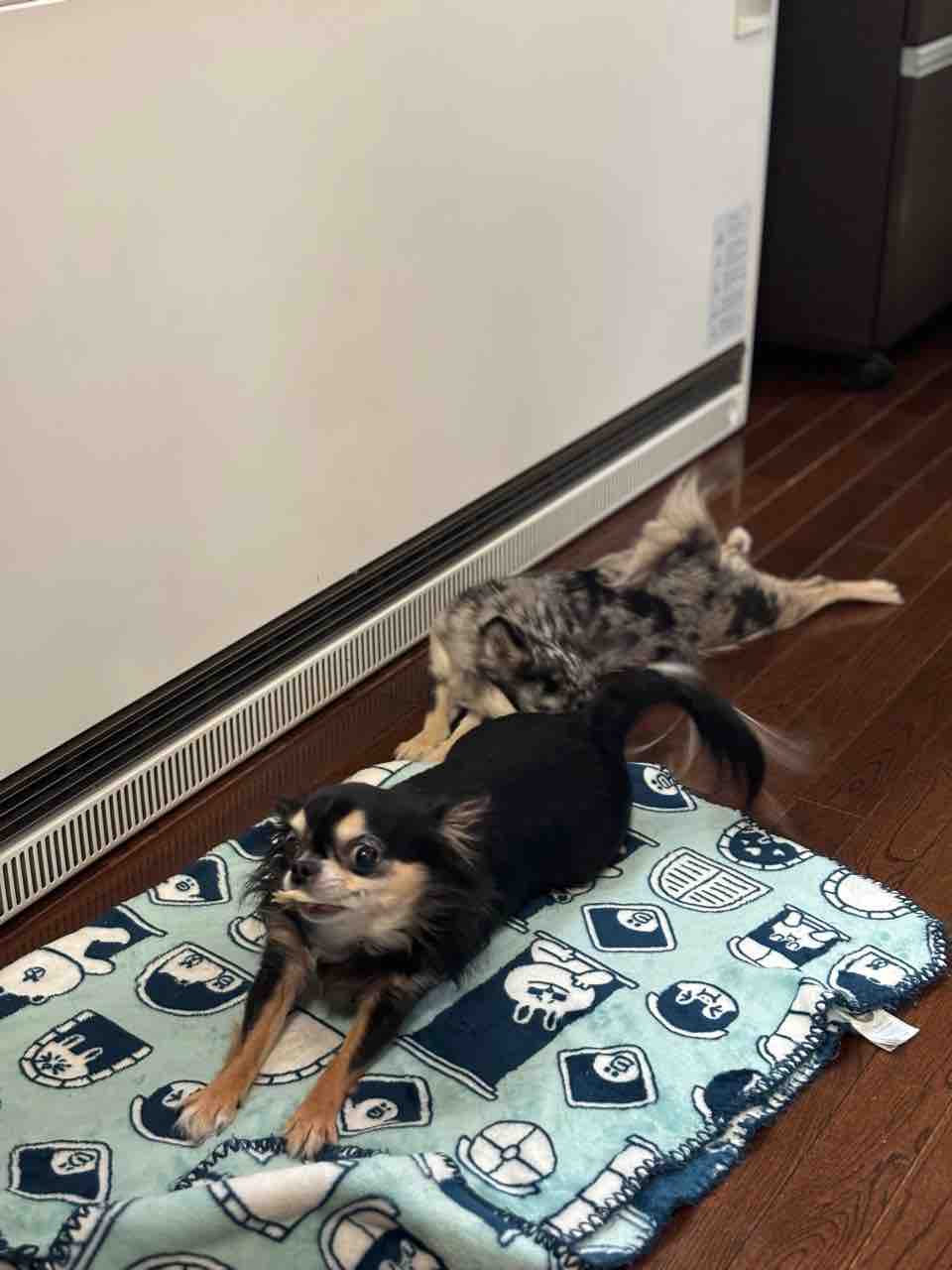 ほんのり暖かい風が心地よいらしく、チワワーズは蓄暖前の虜。