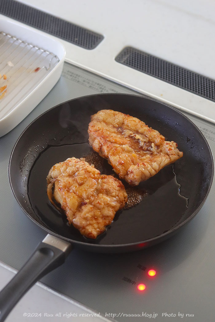 どうせタレにからめるんで、そこで美味しそうな色になります。