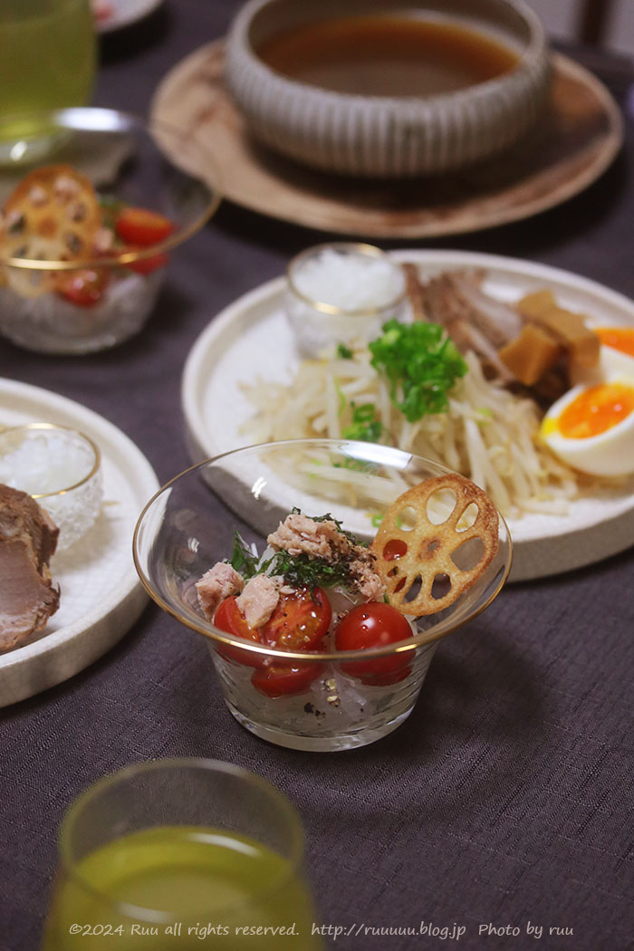 これは、スライスした新玉にソムリエミニトマトと大葉をのせて、ツナ缶をオイルごとかけただけだけのものだけど、