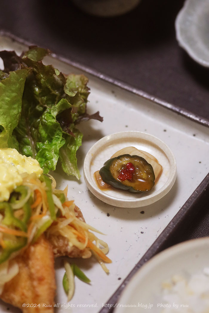 チキン南蛮は、皿にちょっとした余白が生まれたんで、この前作ったヤンパチャンアチも添えて、