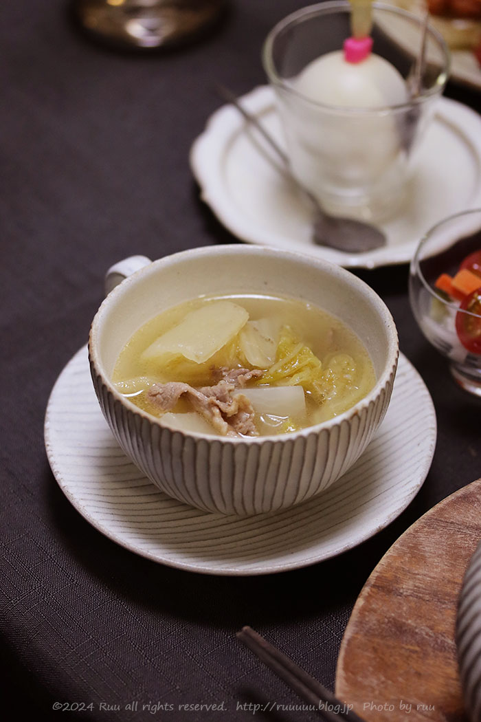 スープはとろっとろな白菜とかぶ、豚肉入り。
