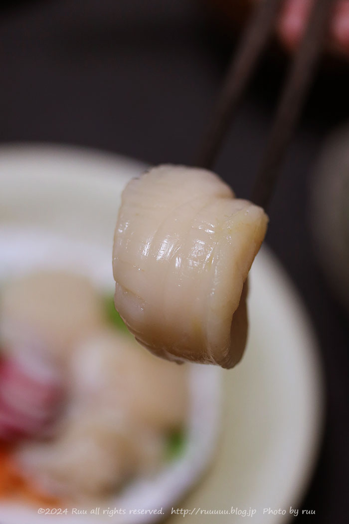 さばきたてのほたては、しっとりとしながらもぷりーんとしたハリがあり、