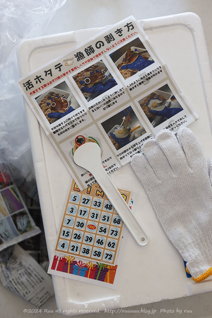 今時のほたては、さばき方のリーフはもちろんのこと、軍手もほたてヘラもゴミ袋もぜーーーーんぶついてきますからね、手ぶらでもほたてがさばけます。