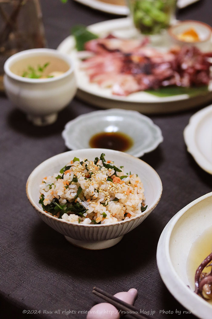 炊いたご飯に鮭フレークと戻したわかめとほんのちょっとの塩を混ぜ、最後に胡麻をふっただけです。