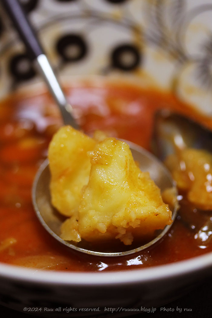 煮込み続けたことですっかり角がとれ、まぁるくなったじゃがいも。