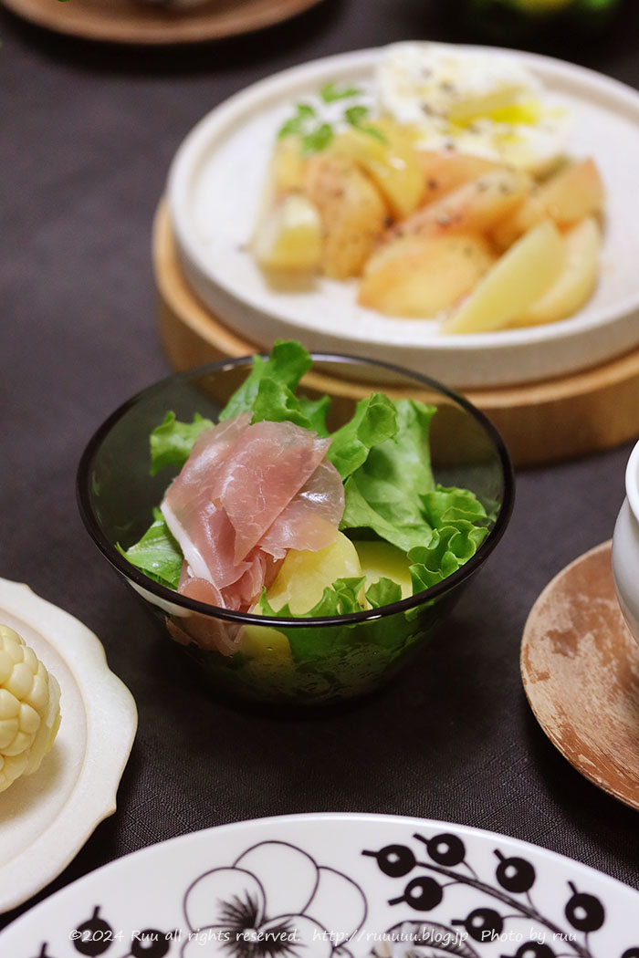 ちぎったレタスに茹でたじゃがいもと生ハムをのせたサラダ。