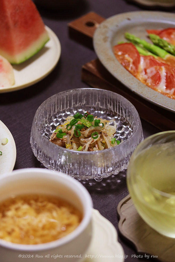 で、チャーシューを刻んだ時にでた端っこは、もやしと合わせてナムルに。