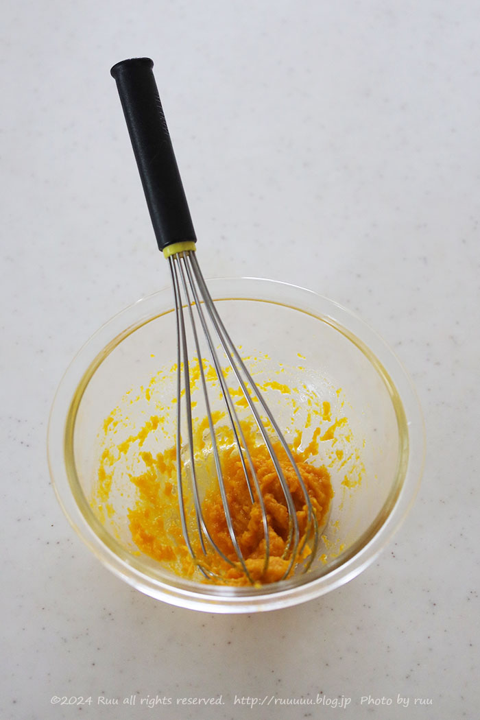 かぼちゃの蒸しパンなら、最初にかぼちゃをチン→泡だて器でぐるぐる混ぜたら(それでマッシュできますんで)、