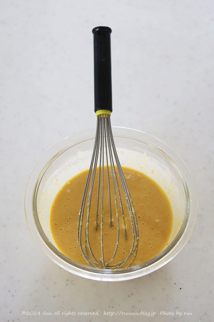 なんらかの油脂と、塩、砂糖、米粉、アーモンドパウダー、なんらかの水分を順序よく入れ、泡だて器でぐ~るぐる。