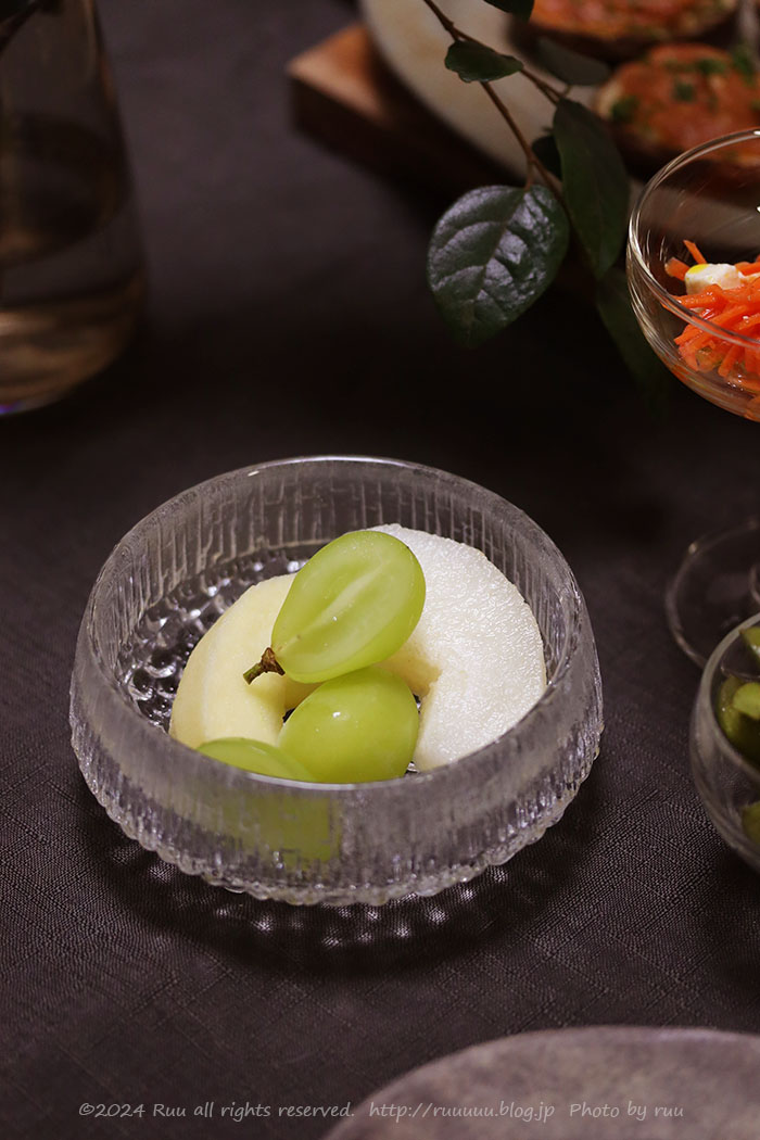 〆のデザートは、梨&りんご&シャインマスカットであっさり。