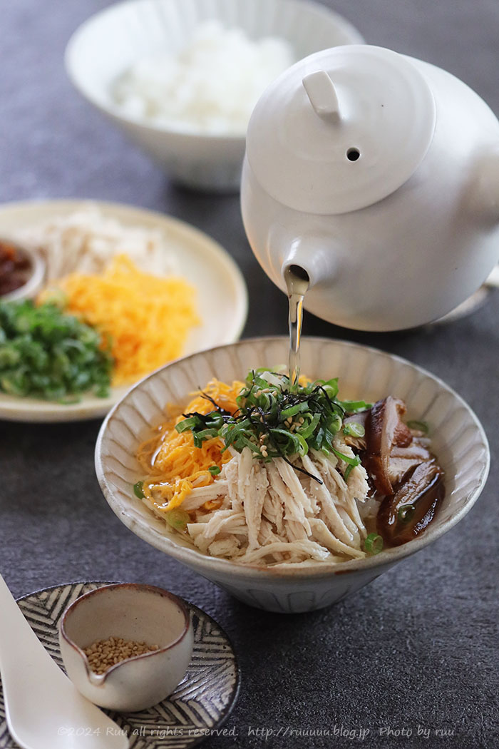 温かいご飯にほぐしたターキー(できれば胸肉の部分がおすすめ)をのせ、錦糸卵やネギ、甘辛く煮た干し椎茸などを添え、たっぷりお出汁をかければ鶏飯風のお茶漬けに。