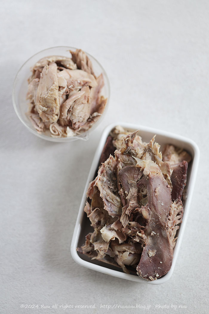 ターキーをさばいた後にでる大量の骨(右)や、個人的に臭みが気になった骨周りのお肉(左)。そのままいただくのはちょっとアレでも、どちらもまだ利用価値があります。